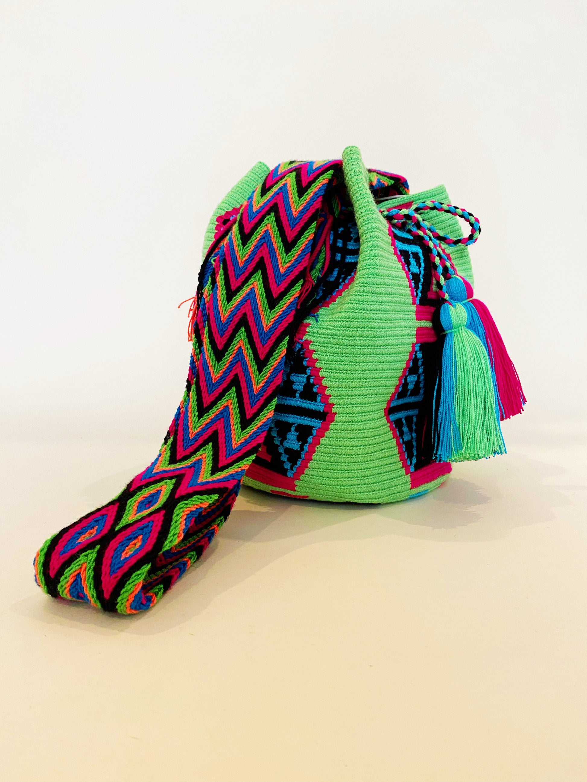 Handmade in Colombia, these one of a kind bags are true works of art with no two bags being exactly the same. Guaranteed authentic. Coming directly from a female artisan in Colombia, these bags can take a woman up to two weeks to complete