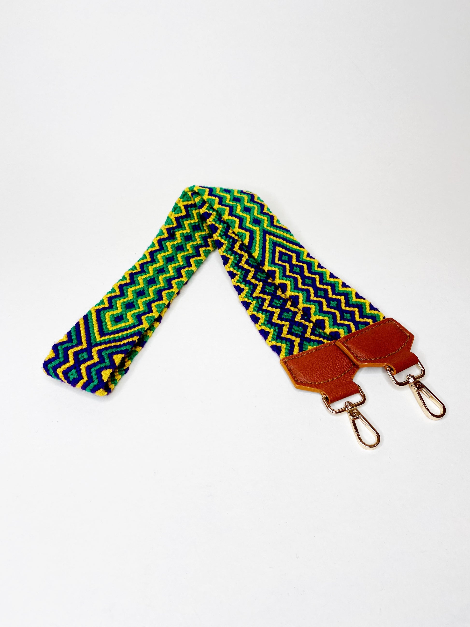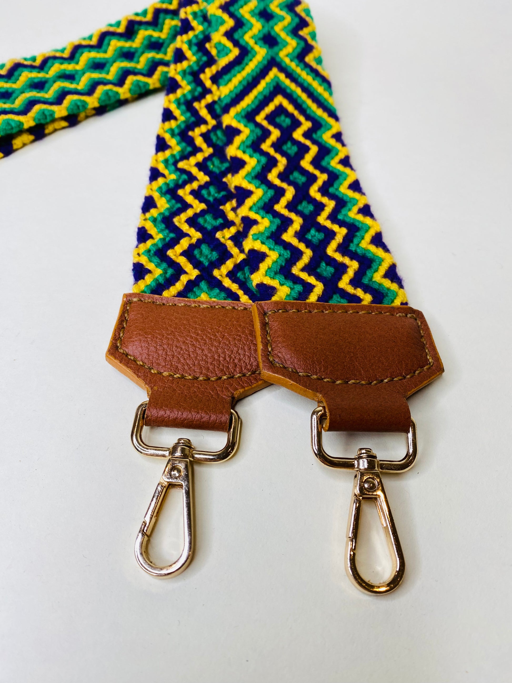 Handwoven multicolor strap with leather details and gold hardware accents.