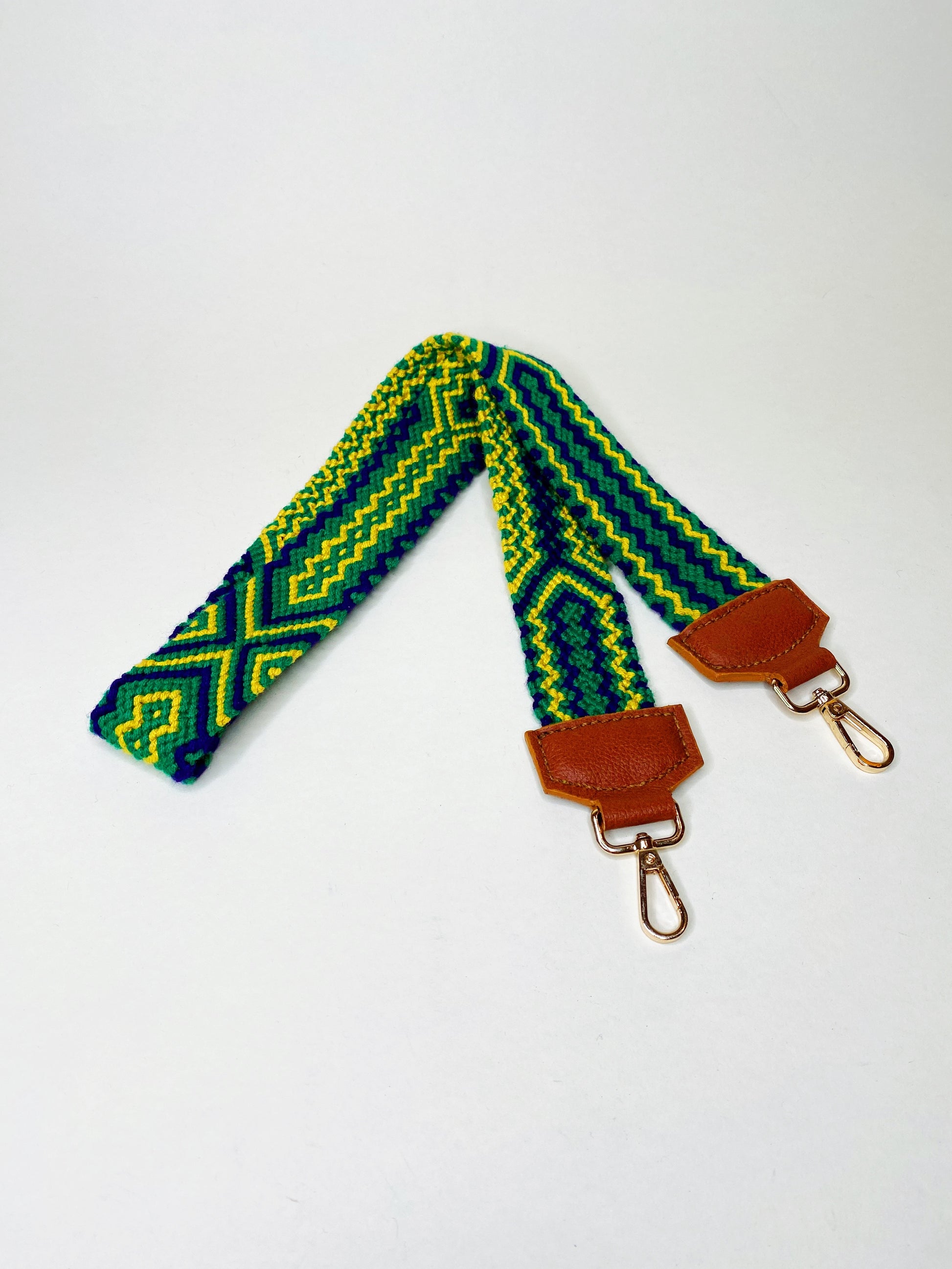 Handwoven multicolor strap with leather details and gold hardware accents.