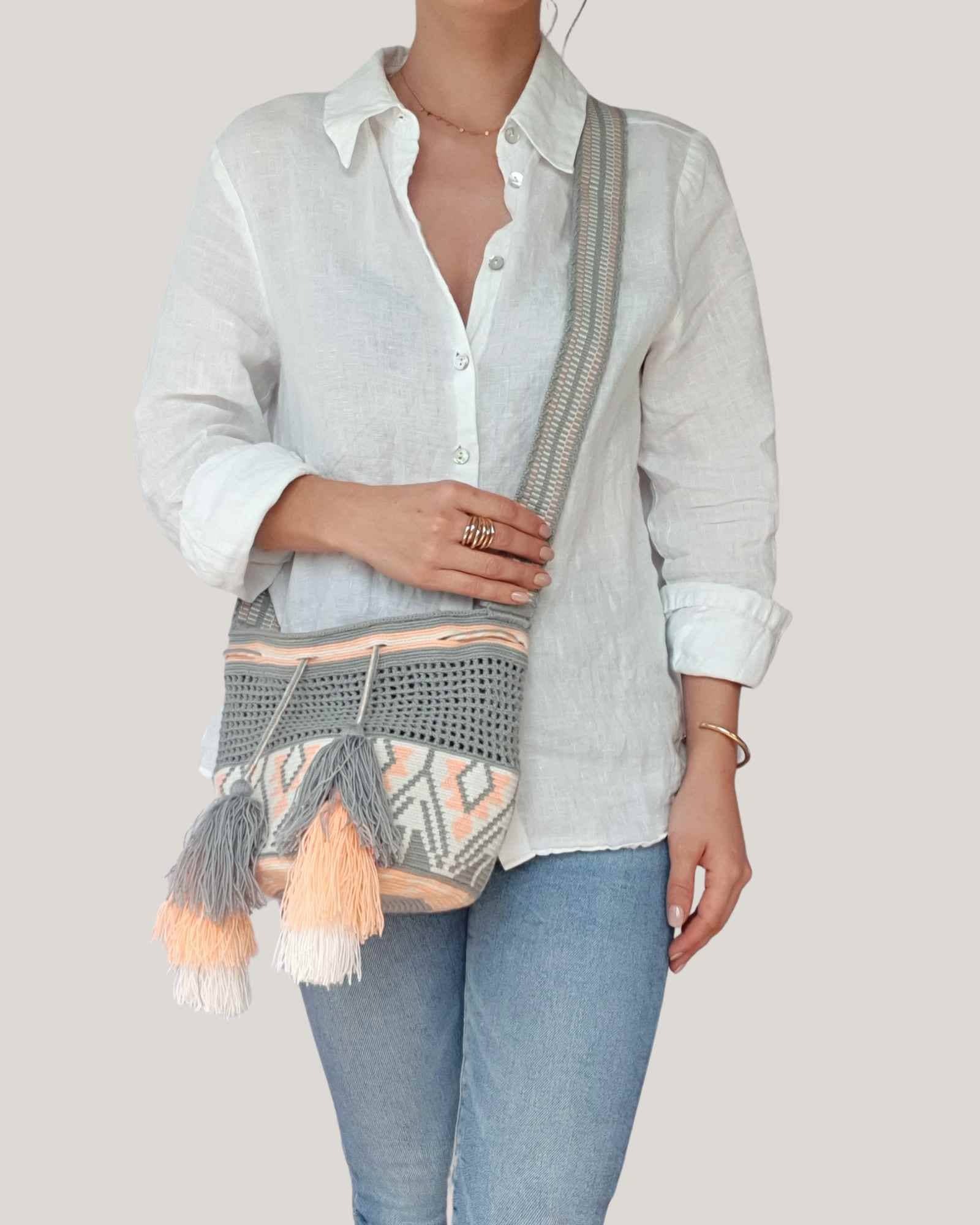 The stunning, one-of-a-kind Wayuu bag is 100% handmade and has been carefully crocheted by artisans from the the desert of Colombia, South America.