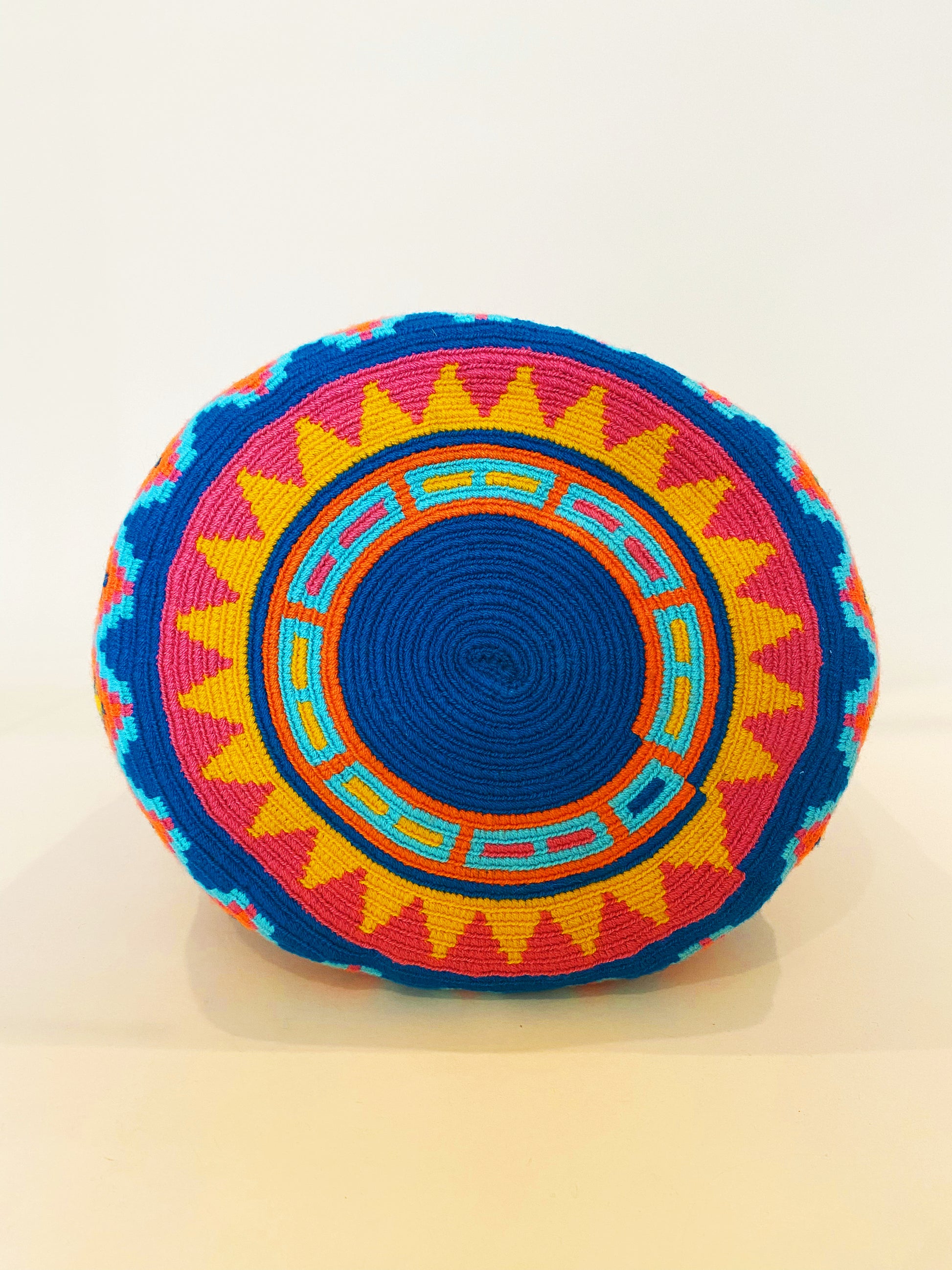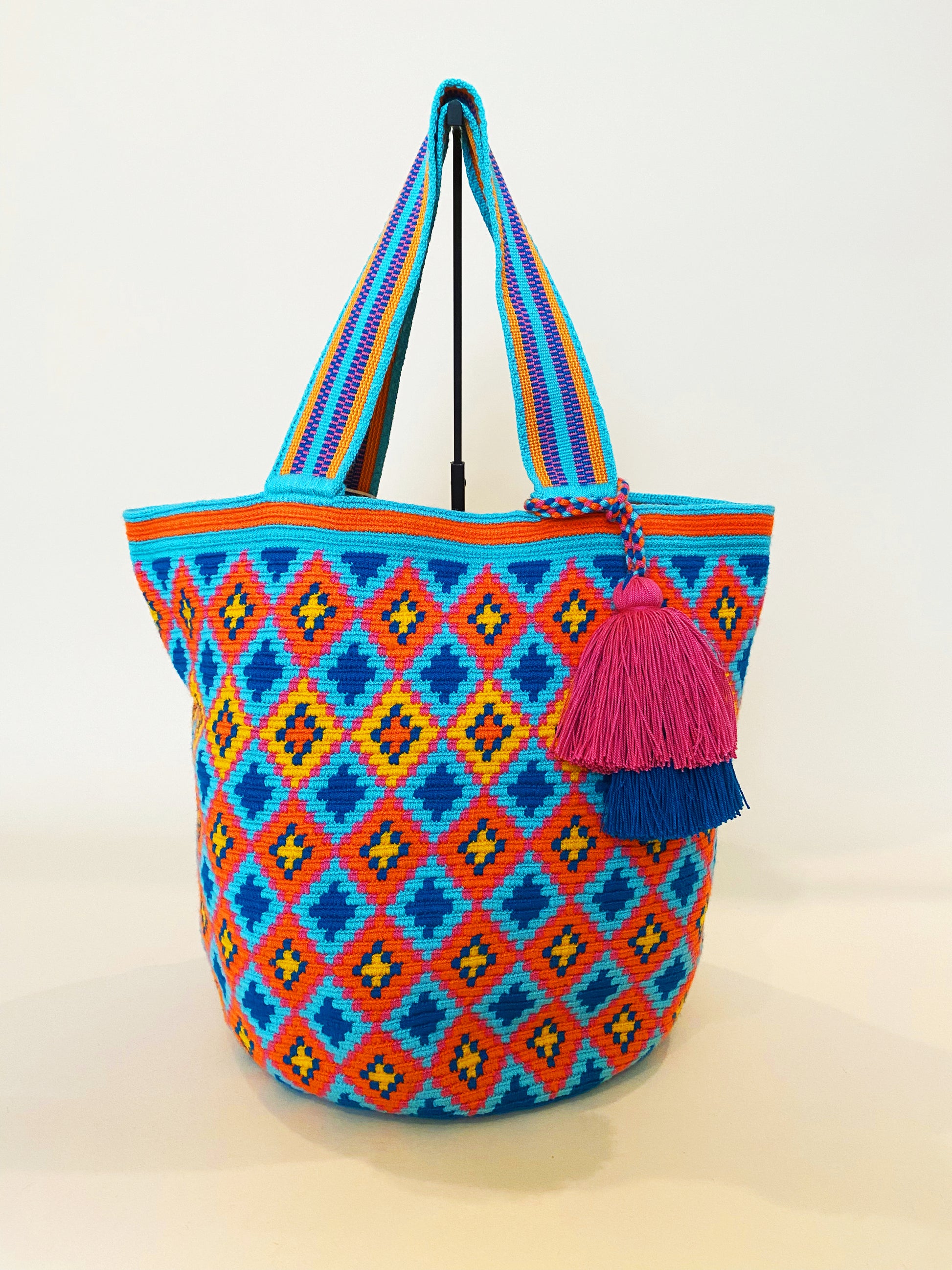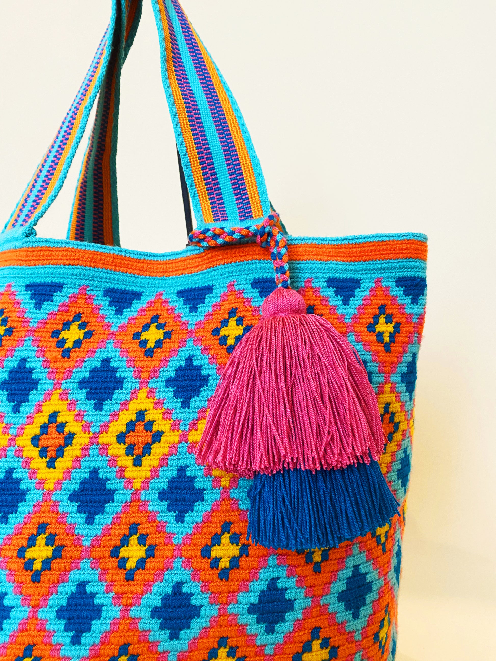 Handwoven in Colombia by a Female Artisan. Each bag can take an artisan up to two weeks to complete, making them true works of art. Even the bottoms of the bags have a unique design…