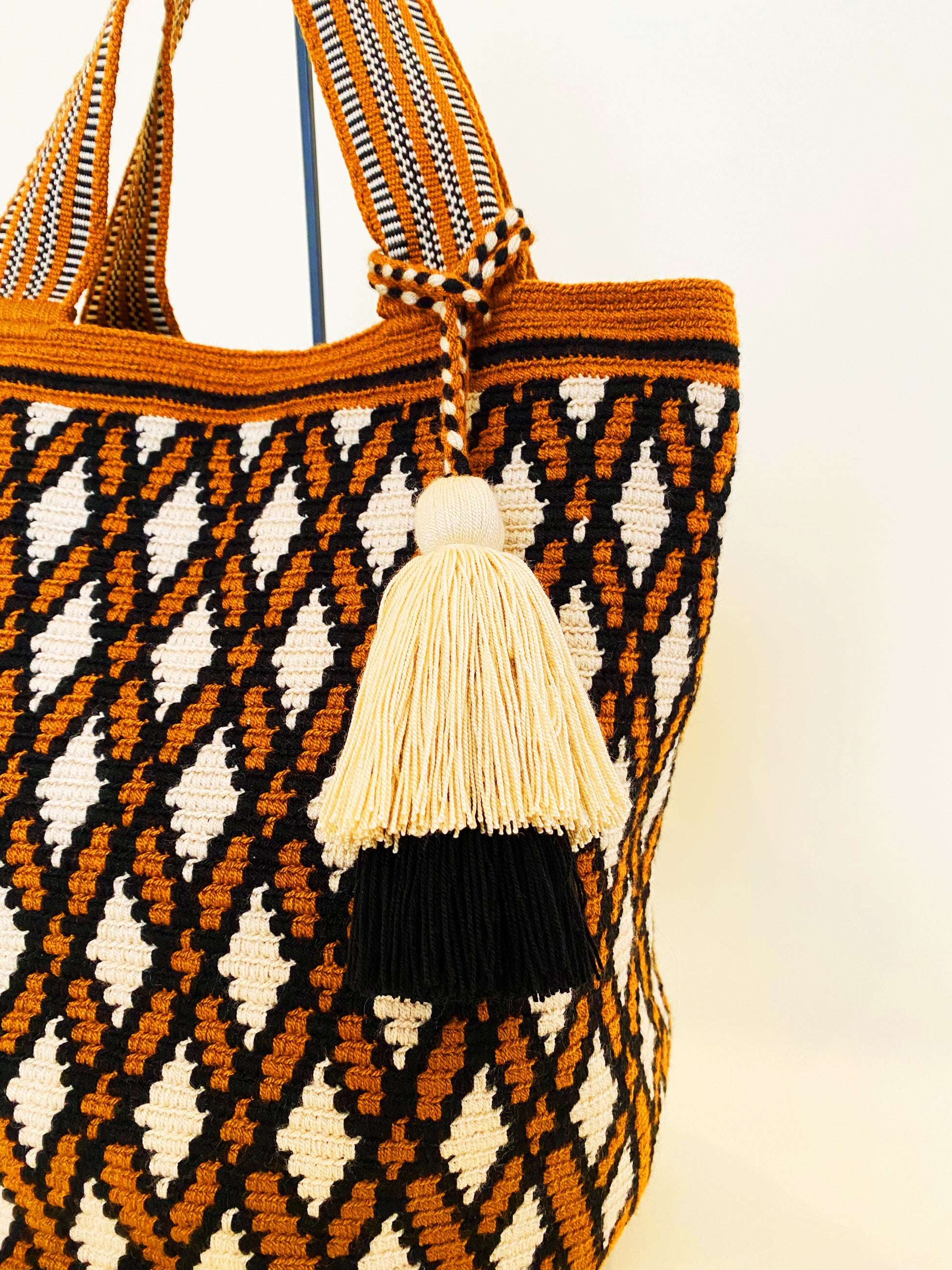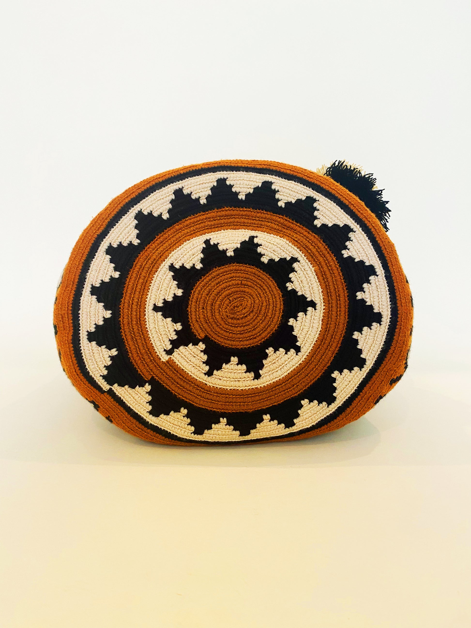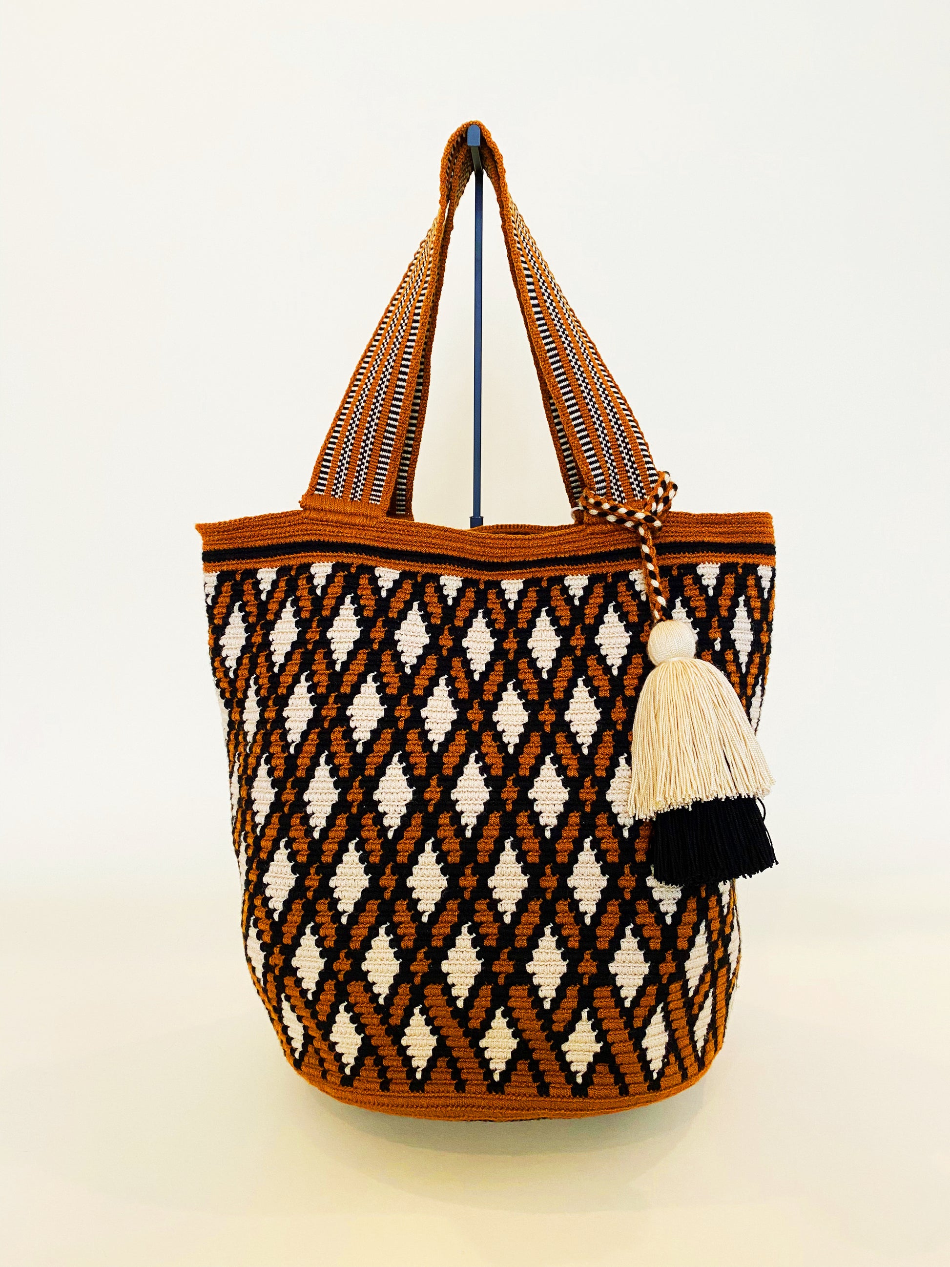 Handwoven in Colombia by a Female Artisan. Each bag can take an artisan up to two weeks to complete, making them true works of art. Even the bottoms of the bags have a unique design…