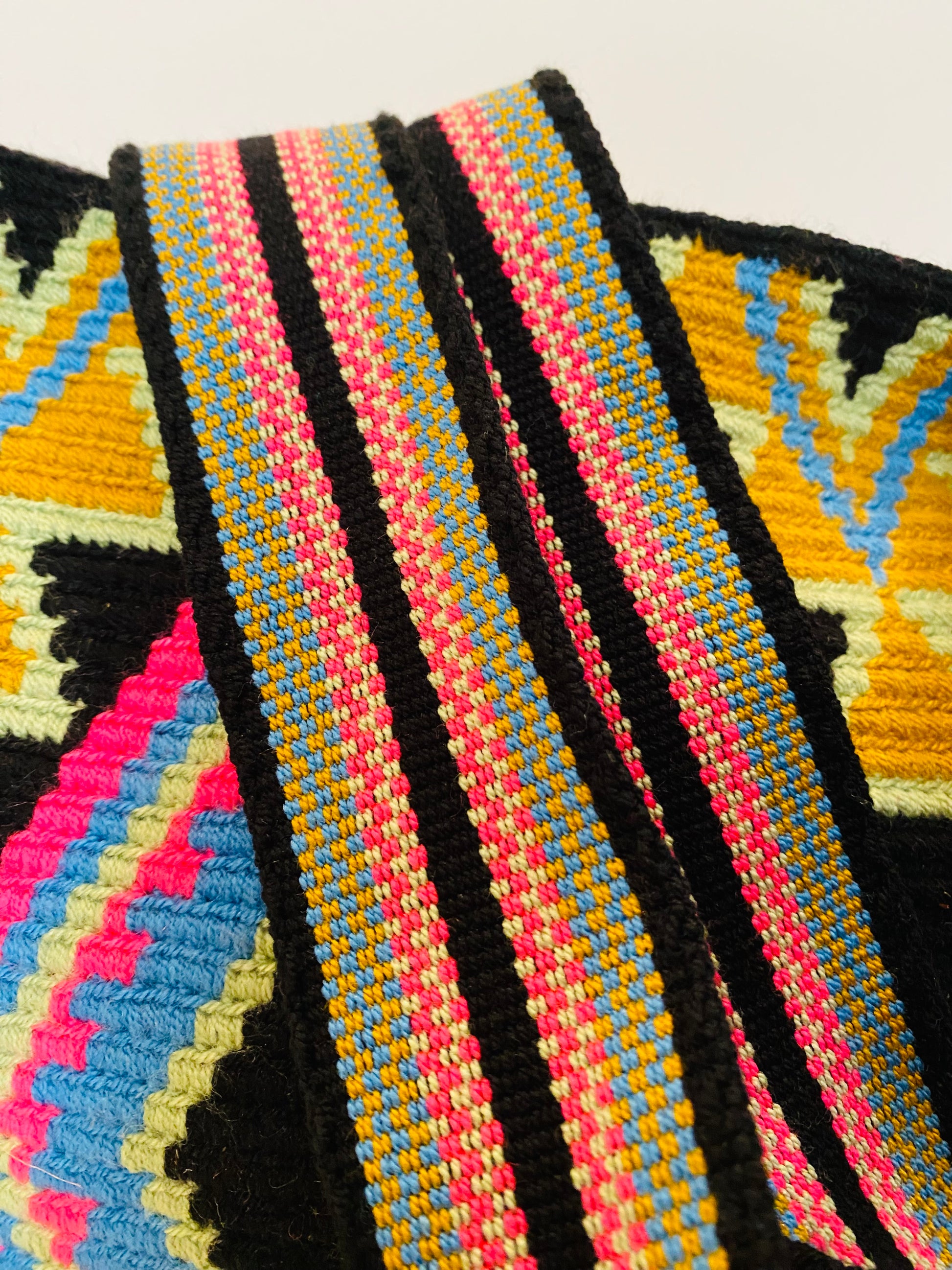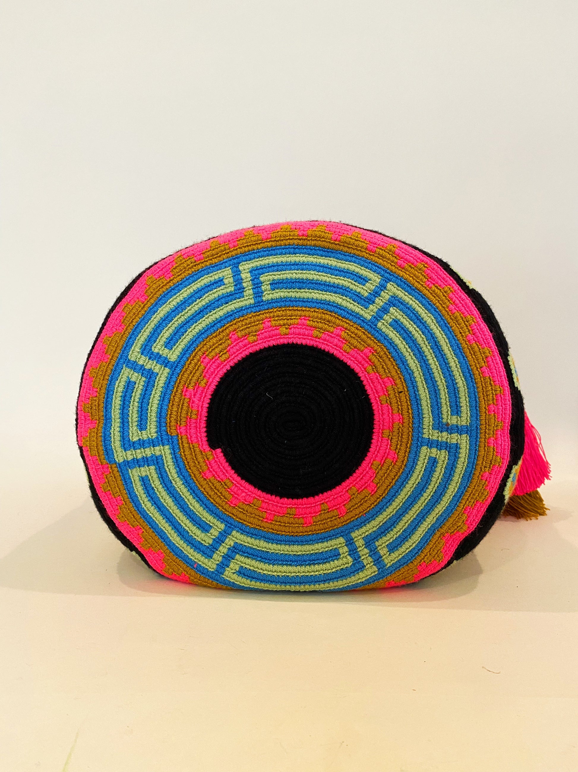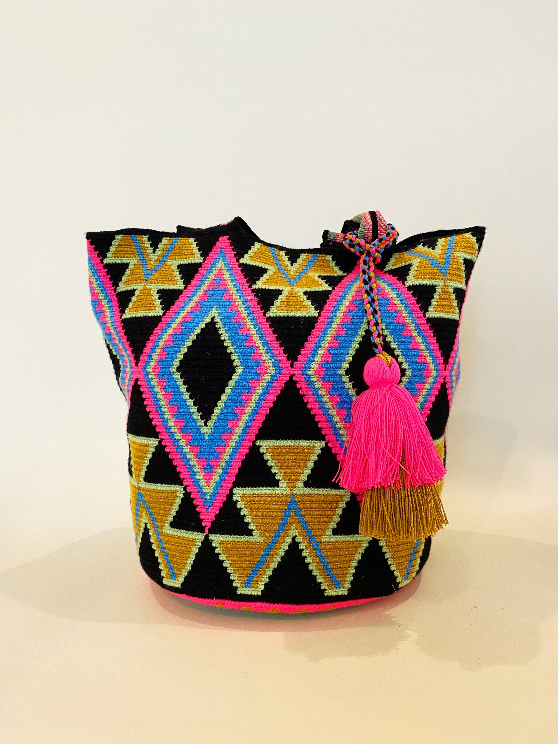 Handwoven in Colombia by a Female Artisan. Each bag can take an artisan up to two weeks to complete, making them true works of art. Even the bottoms of the bags have a unique design.